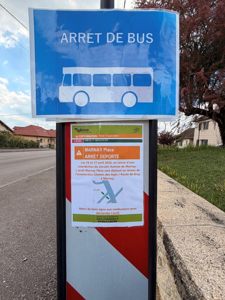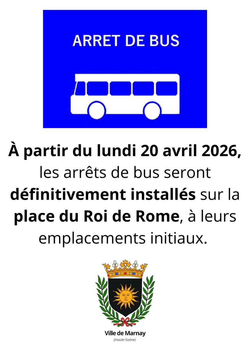 ⚠️ Info Travaux ⚠️ Démarche en ligne Actualités Agenda Galerie photos & vidéos Contacter ma mairie ou un élu Retour Dans le cadre de travaux de réfection de voirie, la circulation sera interdite du jeudi 16 au vendredi 17 avril 2026 à l’intersection de l’avenue Georges Montant, de la Grande Rue et de l’avenue de Marnay-la-Ville. 👉 Des déviations seront mises en place et signalées par des panneaux, par les agents du service technique afin de faciliter vos déplacements. Dans le cadre de travaux de réfection de la voirie prévus jeudi 16 et vendredi 17 avril, les arrêts de bus situés Avenue de Marnay la Ville seront temporairement déplacés. 👉 Pendant la durée des travaux, les arrêts seront reportés à l’intersection du chemin des Âges et de la route de Gray. 📍 À partir du lundi 20 avril 2026, les arrêts de bus seront définitivement installés sur la place du Roi de Rome, à leurs emplacements initiaux. Nous vous remercions pour votre patience et votre compréhension 🙏