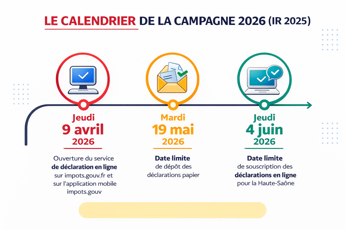 📢 Ouverture de la campagne de déclaration de revenus ! 📢 Démarche en ligne Actualités Agenda Galerie photos & vidéos Contacter ma mairie ou un élu Retour 💻 Vous pouvez effectuer votre déclaration sur impots.gouv.fr à partir du jeudi 9 avril 2026. 🆕 Nouveauté en 2026 Les agents du SIP de Vesoul tiendront des permanences sur rendez-vous uniquement : 📅 29 avril 📅 13 mai 📅 27 mai 🕐 de 13h30 à 16h45 *Rendez-vous auprès de l’Espace France services de Marnay 👇 Vous avez des difficultés avec l’outil numérique ? Besoin d’aide pour compléter votre déclaration papier ou en ligne ? Les agents France services sont là pour vous accompagner. 📞 Pour prendre rendez-vous, contactez les agents France services de Marnay ➡️ au 03 84 31 74 42 🕘 du lundi au samedi de 9h à 12h Factures des collectivités locales 👇 Depuis le 15 décembre 2025, les factures des collectivités locales encaissées par la DGFIP sont accessibles directement depuis votre espace en ligne sur 👉 impots.gouv.fr 📄 L’envoi des factures papier est maintenu : la dématérialisation reste au choix des usagers.