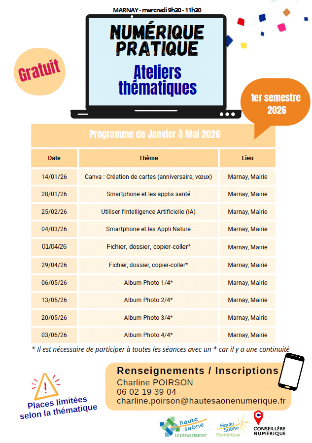 Ateliers thématique Démarche en ligne Actualités Agenda Galerie photos & vidéos Contacter ma mairie ou un élu Retour La France Services de Marnay accueille une session d’ateliers thématiques animés par Charline POIRSON, conseillère numérique à Haute-Saône Numérique, dès le mercredi 14 janvier 2026 à Marnay ! 💻 Informations pratiques : Lieu : Bureau Perrot – 2 rue Carnot 70150 MARNAY Horaires : Les mercredis de 9h30 à 11h30 Inscription : Les places étant limitées, merci de vous inscrire à l’avance en appelant le 06 02 19 39 04 ou en envoyant un e-mail à charline.poirson@hautesaonenumerique.fr ou en déposant votre bulletin d’inscription à l’accueil de votre espace France services de Marnay 👇 Tarif : Gratuit Pour plus d’informations, n’hésitez pas à nous contacter.