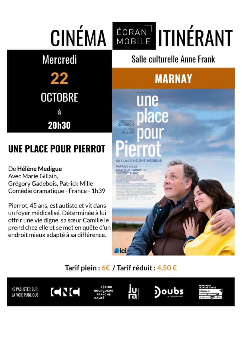 CinĂ©ma 🎬 Film : Une place pour Pierrot DĂ©marche en ligne ActualitĂ©s Agenda Galerie photos & vidĂ©os Contacter ma mairie ou un Ă©lu Retour Informations Date Le 09.04.2025 Horaires 20h30 Lieu Sale Culturelle Anne Frank - 2 Rue du Collège Organisateur Ville de Marnay La Ville de Marnay vous a concoctĂ© une sĂ©ance de cinĂ©ma assez sympa ! Programmation : 🎬 Film : « Une place pour Pierrot » đź“… Date : Mercredi 22 Octobre 2025 đź•’ Heure : 20h30 📍 Lieu : Salle Culturelle Anne Frank – 2, Rue du Collège – 70150 MARNAY Tarif Normal : 6 € – Tarif rĂ©duit : 4,50 € đź“˝ Synopsis du Film : Pierrot, 45 ans, est autiste et vit dans un foyer mĂ©dicalisĂ©. DĂ©terminĂ©e Ă lui offrir une vie digne, sa sĹ“ur Camille le prend chez elle et se met en quĂŞte d’un endroit mieux adaptĂ© Ă sa diffĂ©rence. Le chemin est long mais c’est la promesse d’une nouvelle vie, au sein de laquelle chacun trouvera sa place. 📲Regardez la Bande Annonce officielle du Film en cliquant ICI #cinema #marnay (Il n’est pas possible de rĂ©server de place en vue de cette sĂ©ance.)