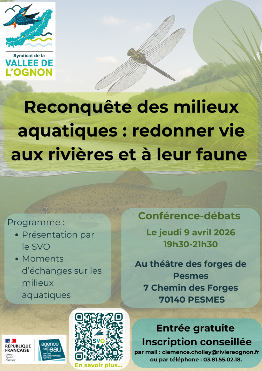 Conférence : Redonner vie aux milieux aquatiques Démarche en ligne Actualités Agenda Galerie photos & vidéos Contacter ma mairie ou un élu Retour Informations Date Le 09.04.2026 Horaires De 19h30 à 21h30 Lieu Au théâtre des forges 7 Chemin des forges 70140 PESMES Organisateur Syndicat de la Vallée de l'Ognon 03 81 55 02 18 clemence.cholley@riviereognon.fr Une conférence gratuites pour mieux comprendre nos rivières ! Le Syndicat de la Vallée de l’Ognon lance cette conférence ouverte à tous Le jeudi 9 avril 2026 de 19h30 à 21h30 Inscription par téléphone : 03 81 55 02 18 Ou par mail : clemence.cholley@riviereognon.fr Plus d’informations ICI