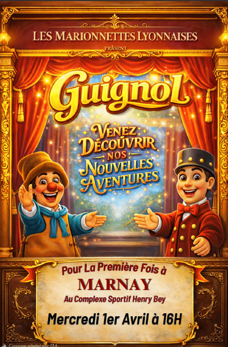Guignol Les Marionnettes Lyonnaises Démarche en ligne Actualités Agenda Galerie photos & vidéos Contacter ma mairie ou un élu Retour Informations Date Le 01.04.2026 Horaires 16h Lieu Complexe Sportif Au Paquey Organisateur 06 61 03 11 34 Figure emblématique du patrimoine lyonnais, Guignol traverse les générations avec un théâtre populaire mêlant humour, interaction avec le public et histoires pleines de rebondissements. 📅 Date : Mercredi 1er avril ⏳ Durée : 45-50 minutes 🎟️ Réservation : sur place 💶 Prix : 9 € (tarif unique) Venez profiter d’un spectacle familial de marionnettes avec le célèbre Guignol !