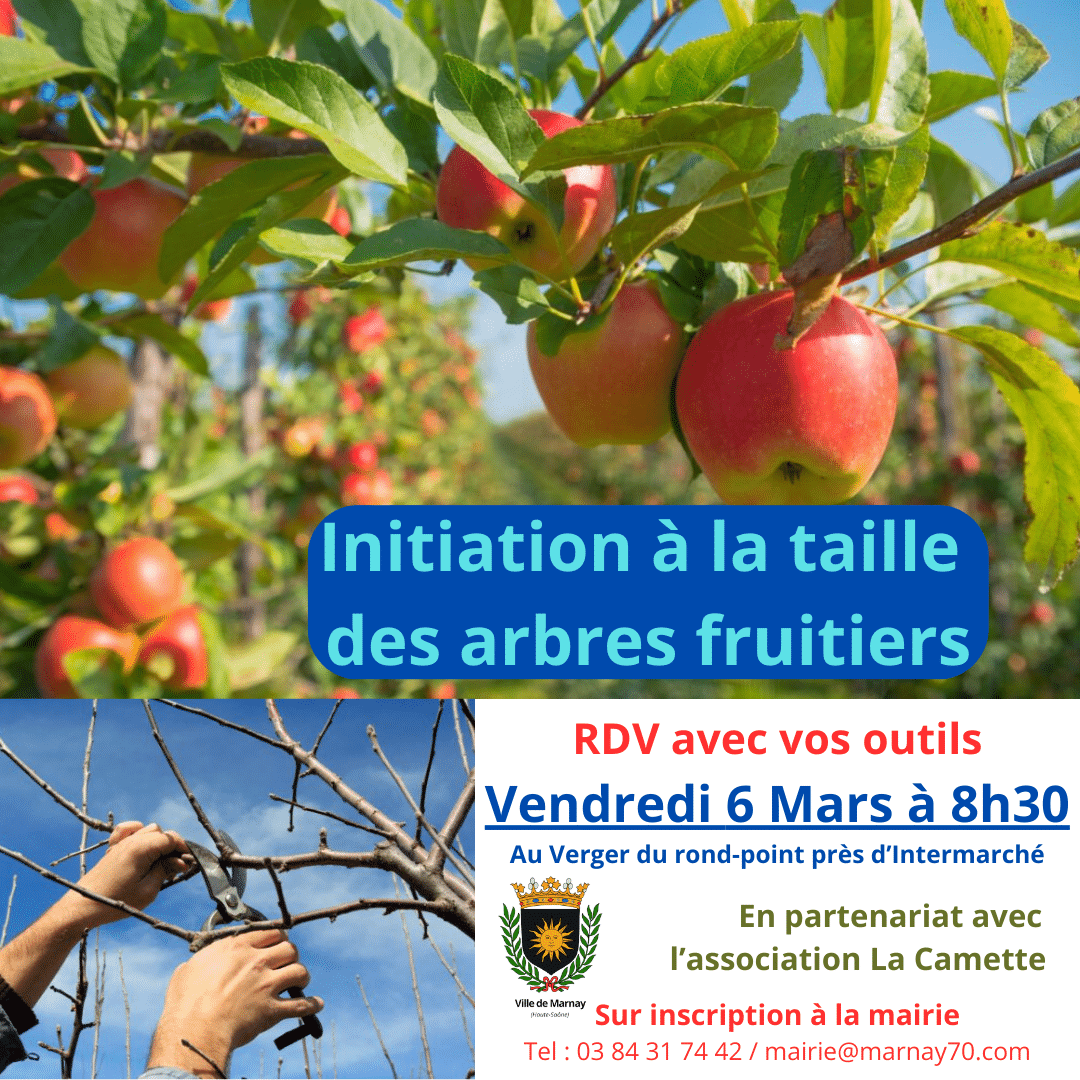 🌳 Initiation Taille des Arbres Fruitiers 🍐 Démarche en ligne Actualités Agenda Galerie photos & vidéos Contacter ma mairie ou un élu Retour Informations Date Le 06.03.2026 Horaires à 8h30 Lieu Au Verger du rond-point de l'Intermarché 70150 MARNAY Organisateur Ville de Marnay 03 84 31 74 42 mairie@marnay70.com La Ville de Marnay en partenariat avec l’association La Camette vous propose une matinée d’initiation à la taille des arbres fruitiers le vendredi 6 Mars à 8h30. Le programme de la journée : – 8h30/9h, accueil et petit café au verger du rond point près d’Intermarché – 9h/10h, formation taille sur les arbres fruitiers – 10h/12h, mise en application sur les arbres Pour vous inscrire : Contactez-nous par mail Ou par téléphone