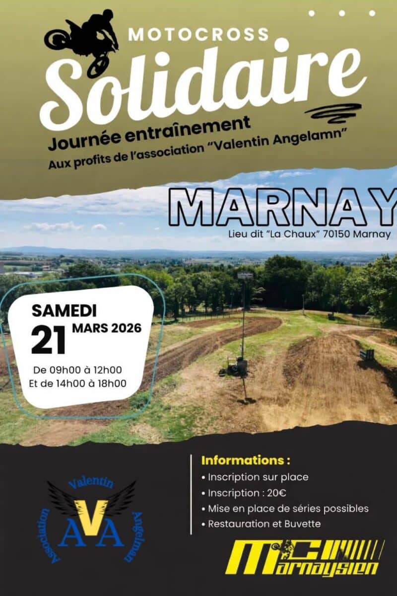 Motocross Solidaire – 2ème édition Démarche en ligne Actualités Agenda Galerie photos & vidéos Contacter ma mairie ou un élu Retour Informations Date Le 21.03.2026 Horaires 9h00 - 12h00 14h00 - 18h00 Lieu Terrain de cross de Marnay Organisateur Moto Club Marnaysien mcmarnaysien@gmail.com Suite au succès de la première édition en 2024, le MC Marnaysien organise une 2ème édition du motocross solidaire le samedi 21 mars 2026 ! Le principe reste le même : organiser une journée d’entraînement motocross ouverte à tous, tout en soutenant une association locale. L’intégralité des bénéfices de la journée sera reversée à une association différente chaque année. Cette année, ils soutiendront l’association Association Valentin Angelman – AVA L’association a été créée pour soutenir Valentin, 6 ans, atteint du syndrome d’Angelman, une maladie génétique rare liée au chromosome 15. L’association a pour objectif d’aider Valentin et sa famille au quotidien, notamment pour financer les soins, les thérapies et le matériel adapté qui lui permettent de progresser et de gagner en autonomie. En participant à cette journée, vous contribuez directement à soutenir Valentin et sa famille Informations pratiques : Date : Samedi 21 mars 2026 Horaires : 9h00 – 12h00 / 14h00 – 18h00 Lieu : Terrain de cross de Marnay Tarif : 20€ (Licence FFM obligatoire) Buvette et restauration sur place