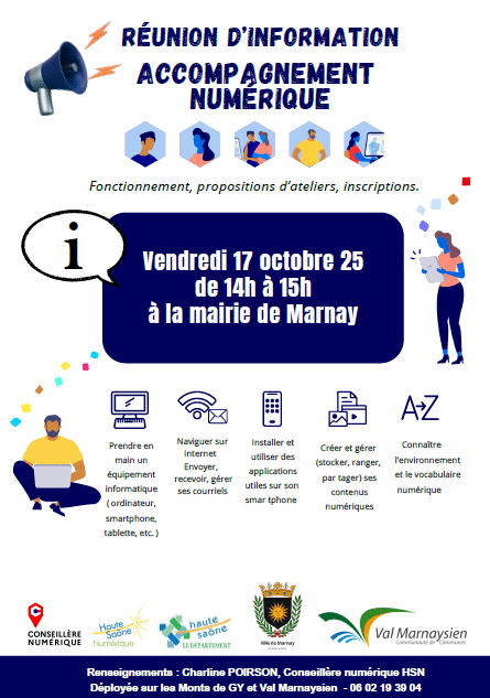đź’» RĂ©union d’information : Ateliers numĂ©riques đź’» DĂ©marche en ligne ActualitĂ©s Agenda Galerie photos & vidĂ©os Contacter ma mairie ou un Ă©lu Retour Informations Date Le 17.10.2025 Horaires 14h Ă 15h Lieu Salle d'Honneur - Mairie 70150 MARNAY Organisateur POIRSON Charline 06 02 19 39 04 charline.poirson@hautesaonenumerique.fr La France Services de Marnay organise une rĂ©union d’information sur les ateliers numĂ©riques Le Vendredi 17 Octobre Ă 14h AnimĂ©e par Charline POIRSON, Conseillère numĂ©rique, intervenant sur les CommunautĂ©s de Communes du Val Marnaysien et des Monts de Gy. Elle prĂ©sentera ses missions et expliquera le dĂ©roulement des ateliers proposĂ©s. âś… La rĂ©union ainsi que les ateliers sont gratuits. Nous vous attendons nombreux ! 👏