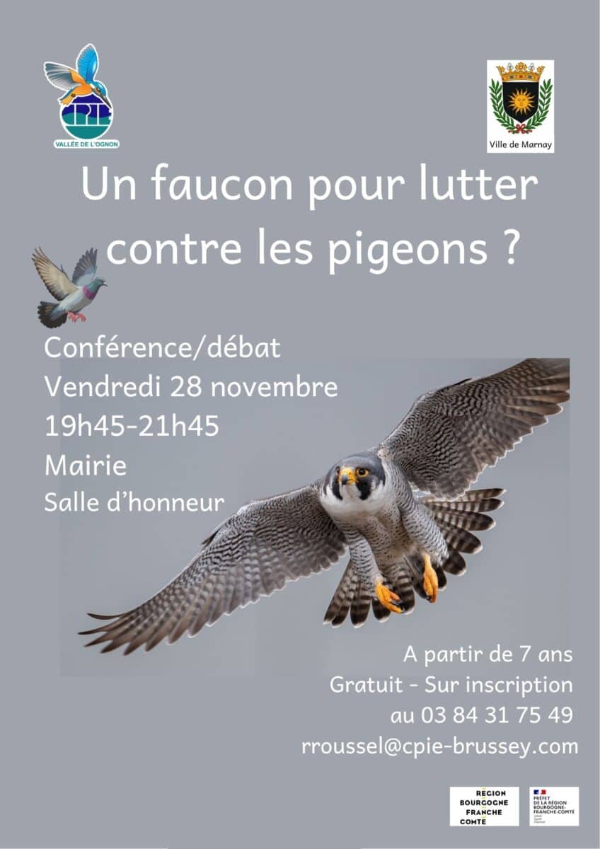 Un faucon pour lutter contre les pigeons ? Démarche en ligne Actualités Agenda Galerie photos & vidéos Contacter ma mairie ou un élu Retour Informations Date Le 28.11.2025 Horaires 19h45-21h45 Lieu Salle d'honneur 2 rue Carnot - 70150 MARNAY Organisateur CPIE de la Vallée de l'Ognon 03 84 31 75 49 rroussel@cpie-brussey.com Rendez-vous le vendredi 28 novembre 2025 à partir de 19h45, salle d’honneur à la mairie de Marnay À partir de 7 ans Inscription obligatoire par téléphone au 03 84 31 75 49 ou par mail : rroussel@cpie-brussey.com Annulation possible en cas de nombre insuffisant de participants
