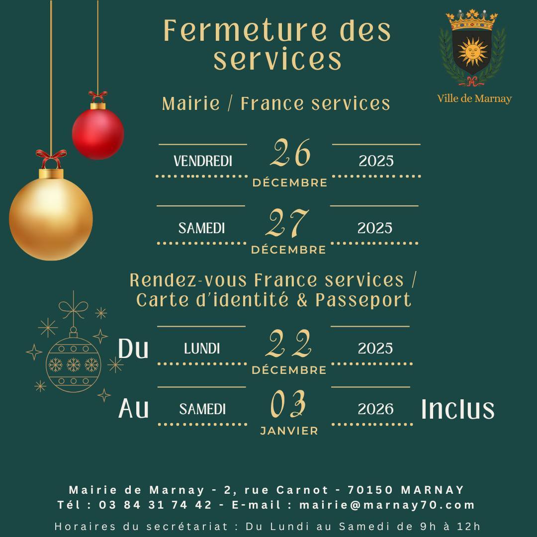 ➡️ Les rendez-vous France Services / Cartes d’identitĂ© et Passeport seront fermĂ©s du lundi 22 dĂ©cembre 2025 au samedi 3 janvier 2026 inclus.