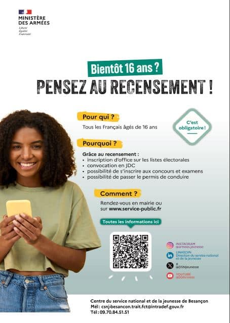 Bientôt 16 ans ? Démarche en ligne Actualités Agenda Galerie photos & vidéos Contacter ma mairie ou un élu Retour 📢 Avis aux jeunes de 16 ans et plus ! 🎂 Tu as 16 ans ? Il est temps de te faire recenser en mairie ! Le recensement citoyen est la seconde étape d’un parcours de citoyenneté qui s’achève avec la Journée défense et citoyenneté (JDC), pour les garçons comme pour les filles. ❓ Pourquoi ?✅ C’est obligatoire et indispensable pour : Passer certains examens (BAC, permis de conduire…) Participer à la Journée Défense et Citoyenneté (JDC) Faciliter ton inscription sur les listes électorales à 18 ans 📅 Quand ?Dès tes 16 ans, et au plus tard dans les 3 mois suivants. 📍 Où ?À ta mairie➡️ Munis-toi de ta carte d’identité, d’un justificatif de domicile et de ton livret de famille. ⚡ Ne tarde pas : c’est rapide et ça peut t’éviter bien des soucis plus tard !