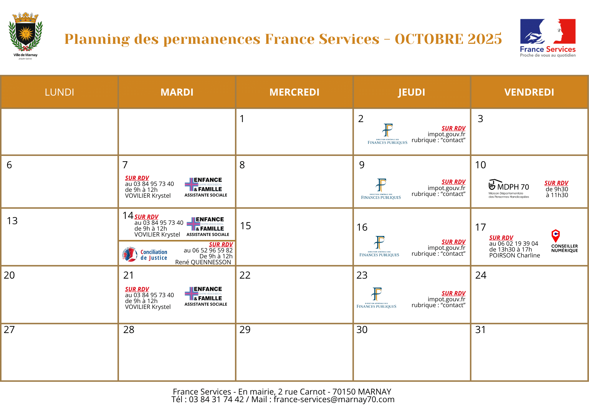 France Services Démarche en ligne Actualités Agenda Galerie photos & vidéos Contacter ma mairie ou un élu Début 2022, un Espace France Services s’est ouvert à la Mairie de Marnay afin de renforcer la présence des services publics de proximité. Ce réseau de structures labellisées France Services se compose d’un guichet unique regroupant plusieurs administrations. Présentation de France Services Adresse et horaires de la France Service de Marnay L’Espace France Services est à disposition du public à la Mairie – 2 Rue Carnot – 70150 MARNAY Léa et Alexis vous accueillent Pour renseignements Du Lundi au Samedi de 9h à 12h Sans RDV Sur RDV uniquement Le Jeudi de 10h00 à 12h00Le Lundi, Jeudi et Vendredi de 14h00 à 17h30 Qu’est-ce que France Services ? France Services est un espace regroupant plusieurs services publics en un lieu unique pour accompagner les citoyens dans l’ensemble des démarches administratives de leur quotidien et leur faciliter l’accès aux services publics. Que vous ayez besoin de conseils sur les démarches administratives ou d’aide à l’utilisation d’un service numérique, vous pouvez vous rendre dans un espace France Services où un agent vous accueillera. Quels sont les services proposés et en quoi cela va faciliter la vie des administrés ? Ce guichet unique permet un accès privilégié à de nombreux Services Publics de l’État tels que : Ministère de l’Intérieur, Ministère de la Justice, Finances Publiques, ainsi que la CAF, la MSA, l’Assurance Maladie, le Pôle Emploi, la CARSAT mais aussi différents partenaires présents sur le territoire, pour répondre aux diverses demandes des citoyens. Nous vous accueillons à Marnay pour : – Vous aider à la compréhension de certains courriers ou documents à remplir– Vous faire aider dans la constitution d’un dossier papier ou sur internet– Suivre votre dossier sur Internet (Pôle Emploi, CAF, CPAM….) – Vous orienter vers le bon interlocuteur en fonction de votre demande– Obtenir un rendez-vous avec un agent d’une administration, si la demande le nécessite.– Obtenir un formulaire (carte d’identité, passeport, formulaires en ligne)– Rédiger et/ou imprimer un courrier, un CV, une lettre de motivation A votre disposition sur place dans notre Espaces France Services – Un ordinateur en accès gratuit connecté à internet et équipé des logiciels de bureautique– Un photocopieur pour vos documents administratifs– Un poste téléphonique– Un espace de confidentialité Les Partenaires de l’Etat : ANAH (Agence nationale de l'habitat) L’ANAH a pour mission d’améliorer le parc privé de logements existants. Elle accorde des aides financières aux propriétaires et accompagne les collectivités dans la mise en œuvre de leur politique de l’habitat privé. Les grandes missions de service public de l’ ANAH : Amplifier la rénovation énergétique Accompagner la perte d’autonomie Soutenir les copropriétés Agir contre l’habitat indigne Améliorer le parc locatif privé Redynamiser les cœurs de ville et les centre anciens Documents consultables et téléchargeables : Logi Adapt’ GUIDE MaPrimeRenov – Juillet 2025 Assurance Retraite Les agents France Services vous accompagnent dans vos démarches pour : Accéder aux droits et démarches vous concernant pour votre retraite Créer votre espace personnel Faire la simulation de vos allocations Déposer ou retirer votre dossier sur internet Cliquez ICI pour accéder à leur Site Internet Je prépare ma retraite Je souhaite prendre ma retraite. Pour cela, je me renseigne sur les différentes possibilités de départ en retraite qui s’offrent à moi. Puis-je choisir la date à laquelle je vais demander ma retraite. Cliquez ICI pour accéder au simulateur de retraite sur service-public.fr Agence située : 13 Boulevard des Alliés – BP 102285 – 70000 VESOUL Contact : 09 71 10 39 60 OU 3960 Caisse d'Allocations Familiales (CAF) Les agents France Services vous accompagnent dans vos démarches pour : Vous informer de manière générale sur les prestations, services et démarches de la CAF Vous aider à comprendre des informations CAF : notifications, courriers, courriels Vous orienter vers l’utilisation du site internet et de l’application mobile Vous aider à constituer les dossiers (télé-procédure, téléchargement des formulaires) Cliquez ICI pour accéder à leur Site Internet Aides personnelles au logement Une aide au logement peut être versée, sous certaine conditions, à toute personne qui loue un logement ou est résident du foyer. Les types d’aides : Aide personnalisée au logement (APL) : Vous souhaitez obtenir une aide financière pour réduire le montant de votre loyer (ou redevance si vous êtes résident en établissement) ? Vous pouvez bénéficier de l’aide personnalisée au logement (APL) si vous respectez certaines conditions. Pour connaître les conditions et démarche à suivre pour en bénéficier selon votre situation, cliquez ici. Allocation de logement familiale (ALF) : Est une aide financière destinée à réduire le montant de votre loyer. Elle est versée en raison de votre situation familiale (vous touchez des prestations familiales, vous avez des personnes à charge..). Les conditions diffèrent selon que vous relevez du régime général de la caisse d’allocations familiales (CAF) ou du régime agricole de la mutualité sociale agricole (MSA). Pour connaître les conditions et démarche à suivre pour en bénéficier selon votre situation, cliquez ici. Allocation logement sociale (ALS): Vous souhaitez obtenir une aide financière pour réduire le montant de votre loyer (ou de votre redevance si vous êtes résident en établissement, par exemple en EHPAD) ? Vous pouvez toucher l’allocation de logement sociale (ALS) si vous respectez certaines conditions. L’ALS est versée si vous ne pouvez prétendre ni à l’aide personnalisée au logement (AL