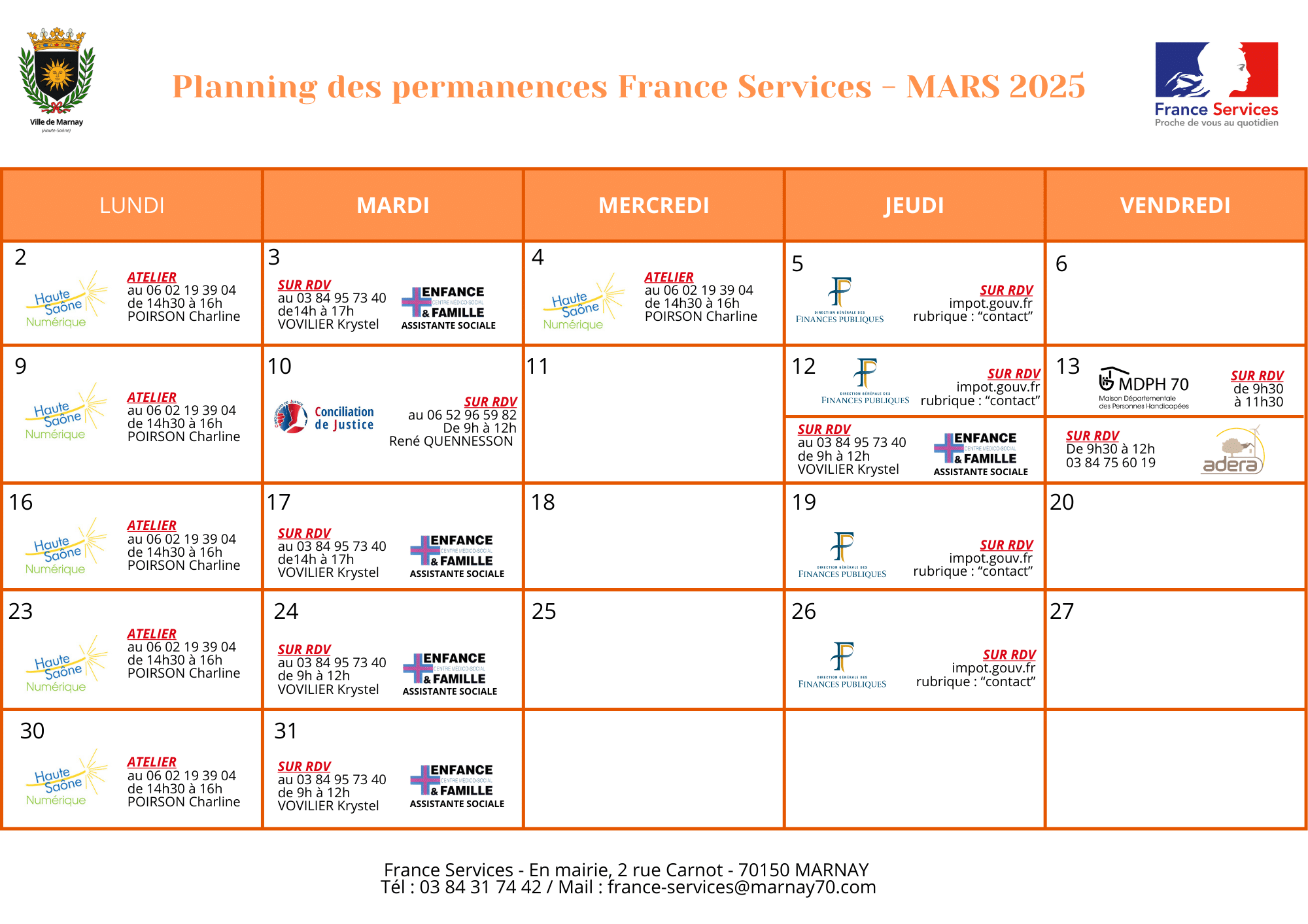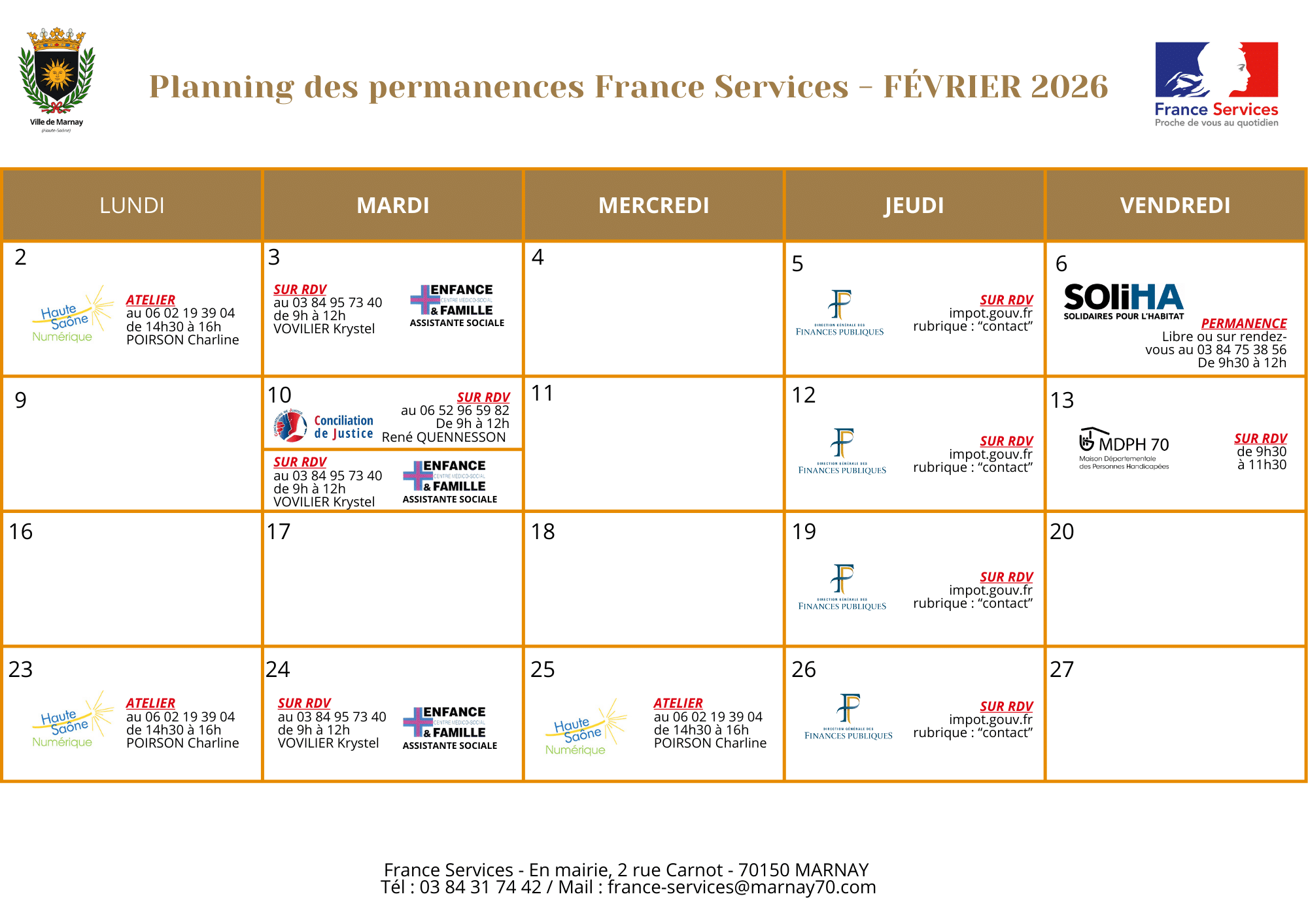 France Services Démarche en ligne Actualités Agenda Galerie photos & vidéos Contacter ma mairie ou un élu Début 2022, un Espace France Services s’est ouvert à la Mairie de Marnay afin de renforcer la présence des services publics de proximité. Ce réseau de structures labellisées France Services se compose d’un guichet unique regroupant plusieurs administrations. Présentation de France Services Adresse et horaires de la France Service de Marnay L’Espace France Services est à disposition du public à la Mairie – 2 Rue Carnot – 70150 MARNAY Alexis et Léa vous accueillent Pour des renseignements Du Lundi au Samedi de 9h à 12h Sans RDV Sur rendez-vous uniquement Le Jeudi de 10h00 à 12h00Le Lundi, Jeudi et Vendredi de 14h00 à 17h30 Qu’est-ce que France Services ? France Services est un espace regroupant plusieurs services publics en un lieu unique pour accompagner les citoyens dans l’ensemble des démarches administratives de leur quotidien et leur faciliter l’accès aux services publics. Que vous ayez besoin de conseils sur les démarches administratives ou d’aide à l’utilisation d’un service numérique, vous pouvez vous rendre dans un espace France Services où un agent vous accueillera. Quels sont les services proposés et en quoi cela va faciliter la vie des administrés ? Ce guichet unique permet un accès privilégié à de nombreux Services Publics de l’État tels que : Ministère de l’Intérieur, Ministère de la Justice, Finances Publiques, ainsi que la CAF, la MSA, l’Assurance Maladie, le Pôle Emploi, la CARSAT mais aussi différents partenaires présents sur le territoire, pour répondre aux diverses demandes des citoyens. Nous vous accueillons à Marnay pour : – Vous aider à la compréhension de certains courriers ou documents à remplir– Vous faire aider dans la constitution d’un dossier papier ou sur internet– Suivre votre dossier sur Internet (Pôle Emploi, CAF, CPAM….) – Vous orienter vers le bon interlocuteur en fonction de votre demande– Obtenir un rendez-vous avec un agent d’une administration, si la demande le nécessite.– Obtenir un formulaire (carte d’identité, passeport, formulaires en ligne)– Rédiger et/ou imprimer un courrier, un CV, une lettre de motivation A votre disposition sur place dans notre Espaces France Services – Un ordinateur en accès gratuit connecté à internet et équipé des logiciels de bureautique– Un photocopieur pour vos documents administratifs– Un poste téléphonique– Un espace de confidentialité Les Partenaires de l’Etat : ANAH (Agence nationale de l'habitat) L’ANAH a pour mission d’améliorer le parc privé de logements existants. Elle accorde des aides financières aux propriétaires et accompagne les collectivités dans la mise en œuvre de leur politique de l’habitat privé. Les grandes missions de service public de l’ ANAH : Amplifier la rénovation énergétique Accompagner la perte d’autonomie Soutenir les copropriétés Agir contre l’habitat indigne Améliorer le parc locatif privé Redynamiser les cœurs de ville et les centre anciens Documents consultables et téléchargeables : Logi Adapt’ GUIDE MaPrimeRenov – Juillet 2025 Assurance Retraite Les agents France Services vous accompagnent dans vos démarches pour : Accéder aux droits et démarches vous concernant pour votre retraite Créer votre espace personnel Faire la simulation de vos allocations Déposer ou retirer votre dossier sur internet Cliquez ICI pour accéder à leur Site Internet Je prépare ma retraite Je souhaite prendre ma retraite. Pour cela, je me renseigne sur les différentes possibilités de départ en retraite qui s’offrent à moi. Puis-je choisir la date à laquelle je vais demander ma retraite. Cliquez ICI pour accéder au simulateur de retraite sur service-public.fr Agence située : 13 Boulevard des Alliés – BP 102285 – 70000 VESOUL Contact : 09 71 10 39 60 OU 3960 Caisse d'Allocations Familiales (CAF) Les agents France Services vous accompagnent dans vos démarches pour : Vous informer de manière générale sur les prestations, services et démarches de la CAF Vous aider à comprendre des informations CAF : notifications, courriers, courriels Vous orienter vers l’utilisation du site internet et de l’application mobile Vous aider à constituer les dossiers (télé-procédure, téléchargement des formulaires) Cliquez ICI pour accéder à leur Site Internet Aides personnelles au logement Une aide au logement peut être versée, sous certaine conditions, à toute personne qui loue un logement ou est résident du foyer. Les types d’aides : Aide personnalisée au logement (APL) : Vous souhaitez obtenir une aide financière pour réduire le montant de votre loyer (ou redevance si vous êtes résident en établissement) ? Vous pouvez bénéficier de l’aide personnalisée au logement (APL) si vous respectez certaines conditions. Pour connaître les conditions et démarche à suivre pour en bénéficier selon votre situation, cliquez ici. Allocation de logement familiale (ALF) : Est une aide financière destinée à réduire le montant de votre loyer. Elle est versée en raison de votre situation familiale (vous touchez des prestations familiales, vous avez des personnes à charge..). Les conditions diffèrent selon que vous relevez du régime général de la caisse d’allocations familiales (CAF) ou du régime agricole de la mutualité sociale agricole (MSA). Pour connaître les conditions et démarche à suivre pour en bénéficier selon votre situation, cliquez ici. Allocation logement sociale (ALS): Vous souhaitez obtenir une aide financière pour réduire le montant de votre loyer (ou de votre redevance si vous êtes résident en établissement, par exemple en EHPAD) ? Vous pouvez toucher l’allocation de logement sociale (ALS) si vous respectez certaines conditions. L’ALS est versée si vous ne pouvez prétendre ni à l’aide personnalisée au 